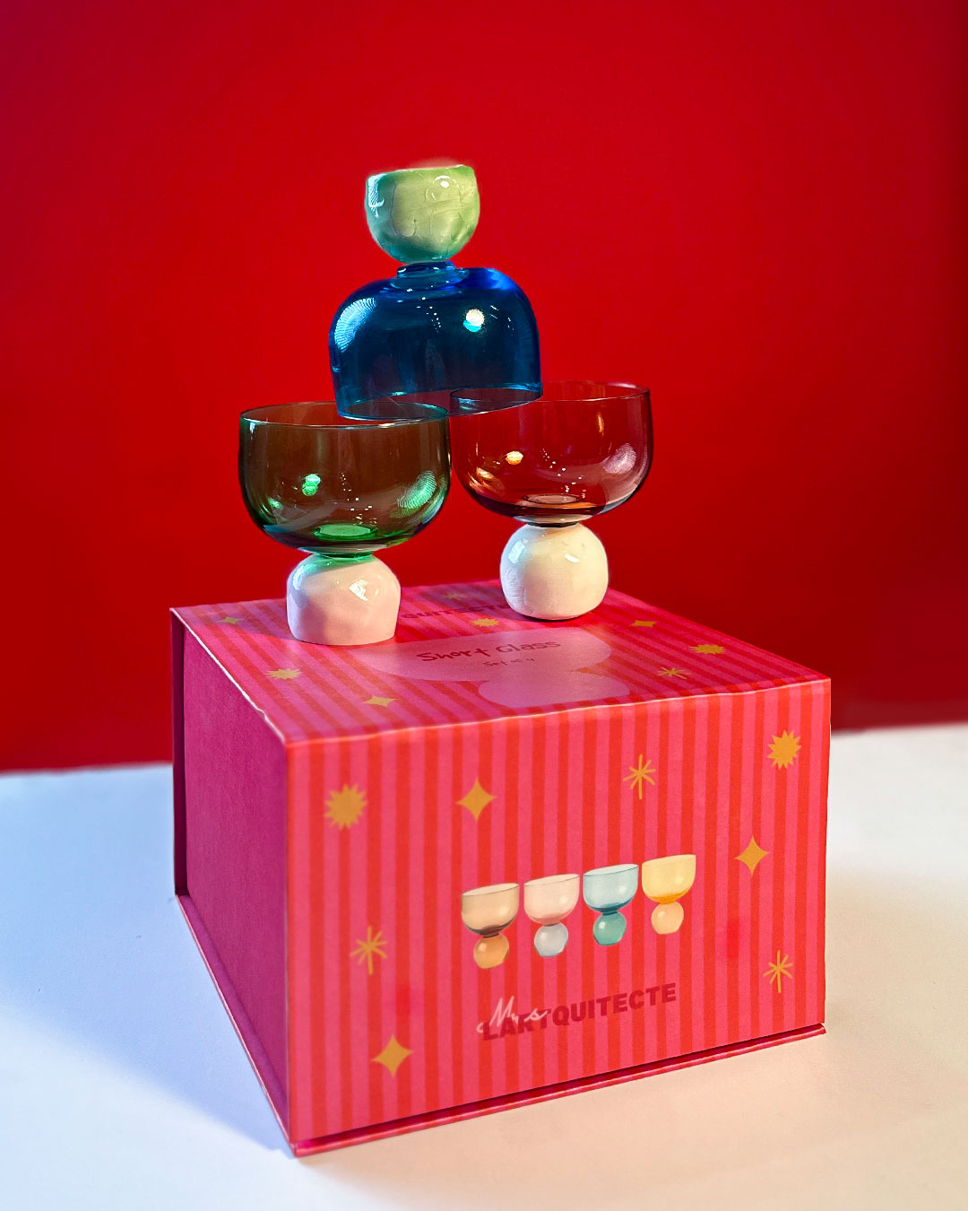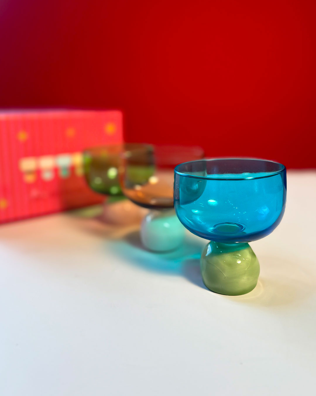 A SET OF FOUR SHORT GLASSES HANDCRAFTED FROM BLOWN GLASS AND