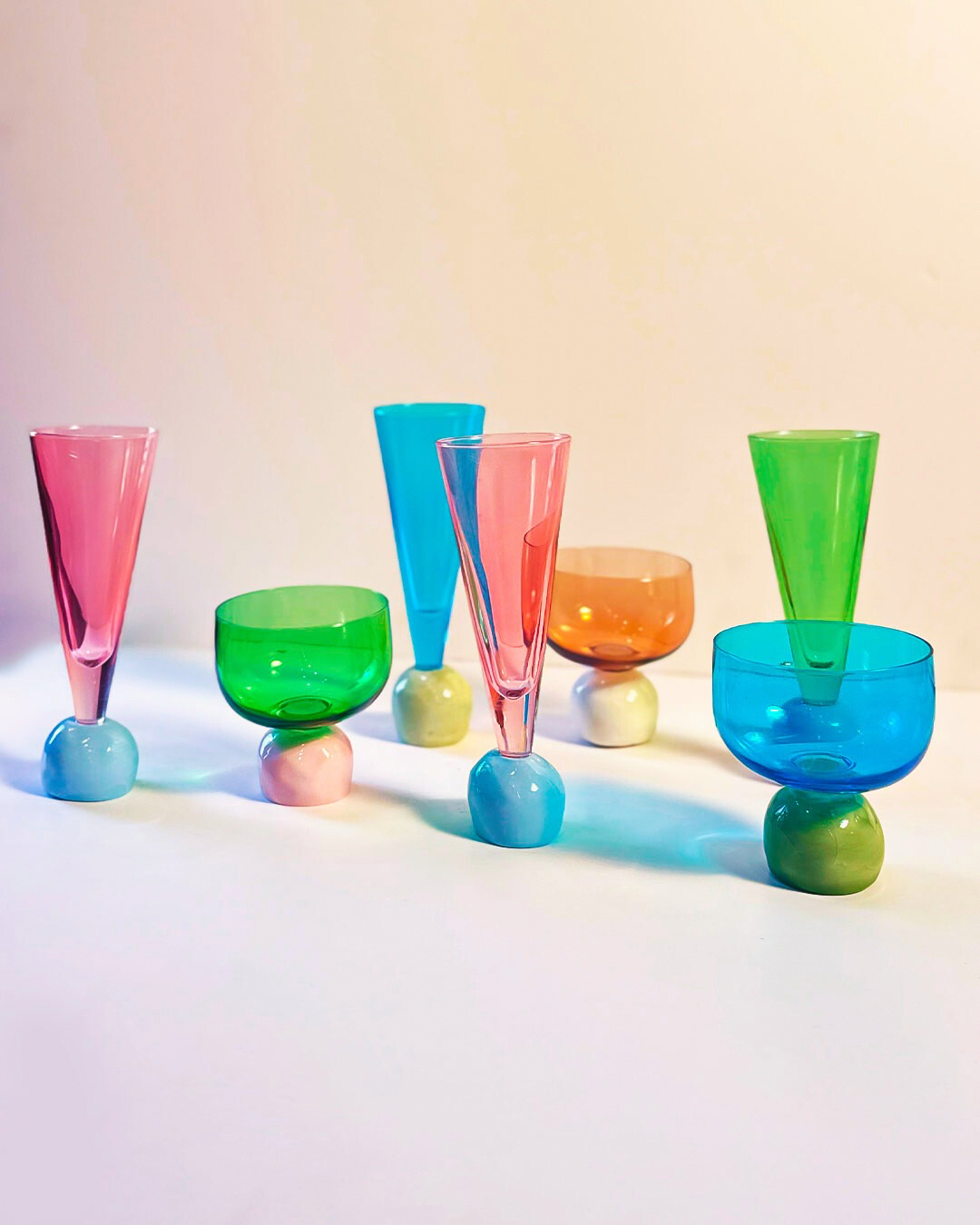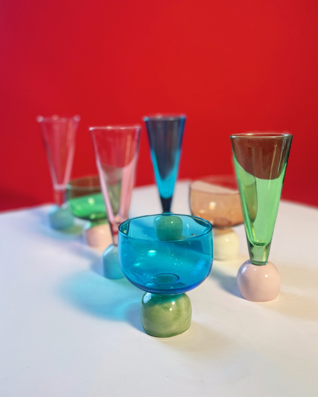 This set of four tall glasses blends blown glass and ceramic in two-tone harmony. Each piece captures light differently, creating a playful yet sophisticated addition to your dining rituals.
